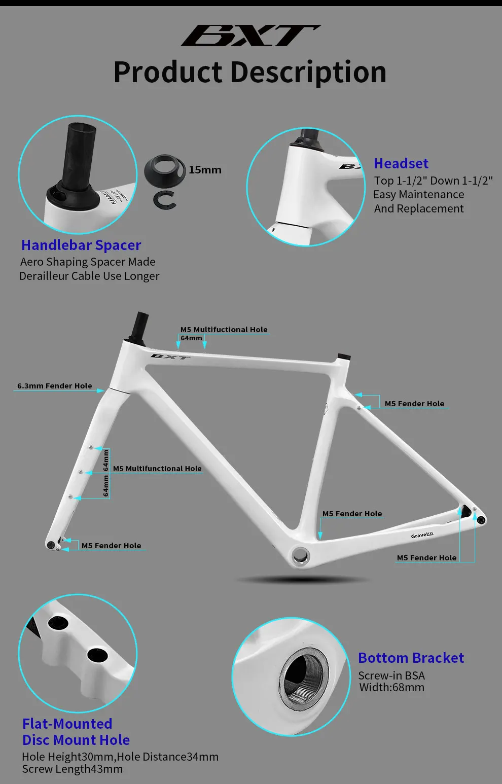 Cadre de vélo de gravel en carbone BXT câble entièrement caché cadre en carbone fourche à travers l’axe frein à disque de gravier cadre de vélo de route